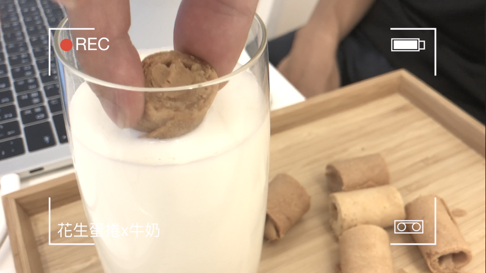 花生蛋捲本來就是比較濃郁綿密的口感,牛奶比較沒辦法跟花生醬直接融合,但外面的蛋捲皮可以吸收。