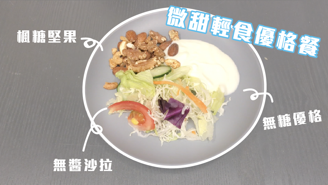 『楓糖綜合堅果』、『輕烘焙綜合堅果』以及任一無糖優格&生菜沙拉,切記!想瘦的朋友不要放沙拉醬喔!